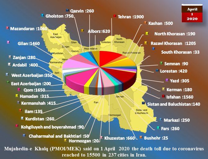 Kianouche Jahanpour, porte-parole du ministère de la Santé lors de son point de presse quotidien annonce à ce jour 2.987 nouveaux cas ces dernières 24 heures, portant le total des cas confirmés à 47.593+ que les autorités iraniennes annoncent un total de 3.036 décès dus au coronavirus le mercredi 1er avril 2020, la Résistance iranienne avance le chiffre de 15.500 décès dans 237 villes en Iran.